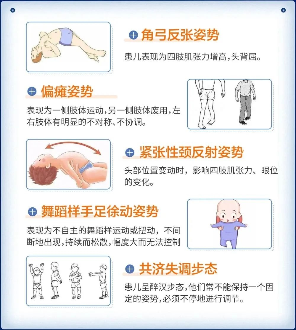 脑瘫患者的肌张力和姿势异常表现为:肌张力增高或低下,肌张力高低变化不定,常有异常的姿势反射。例如,患儿的头和四肢不能保持在中线位上,或呈现弓状反张,或为四肢痉挛。
