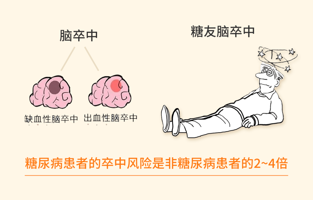 血糖管不好,大脑很受伤,糖尿病患者的中风风险大约是非糖尿病人群的2~4倍。糖尿病是中风的主要危险因素之一。