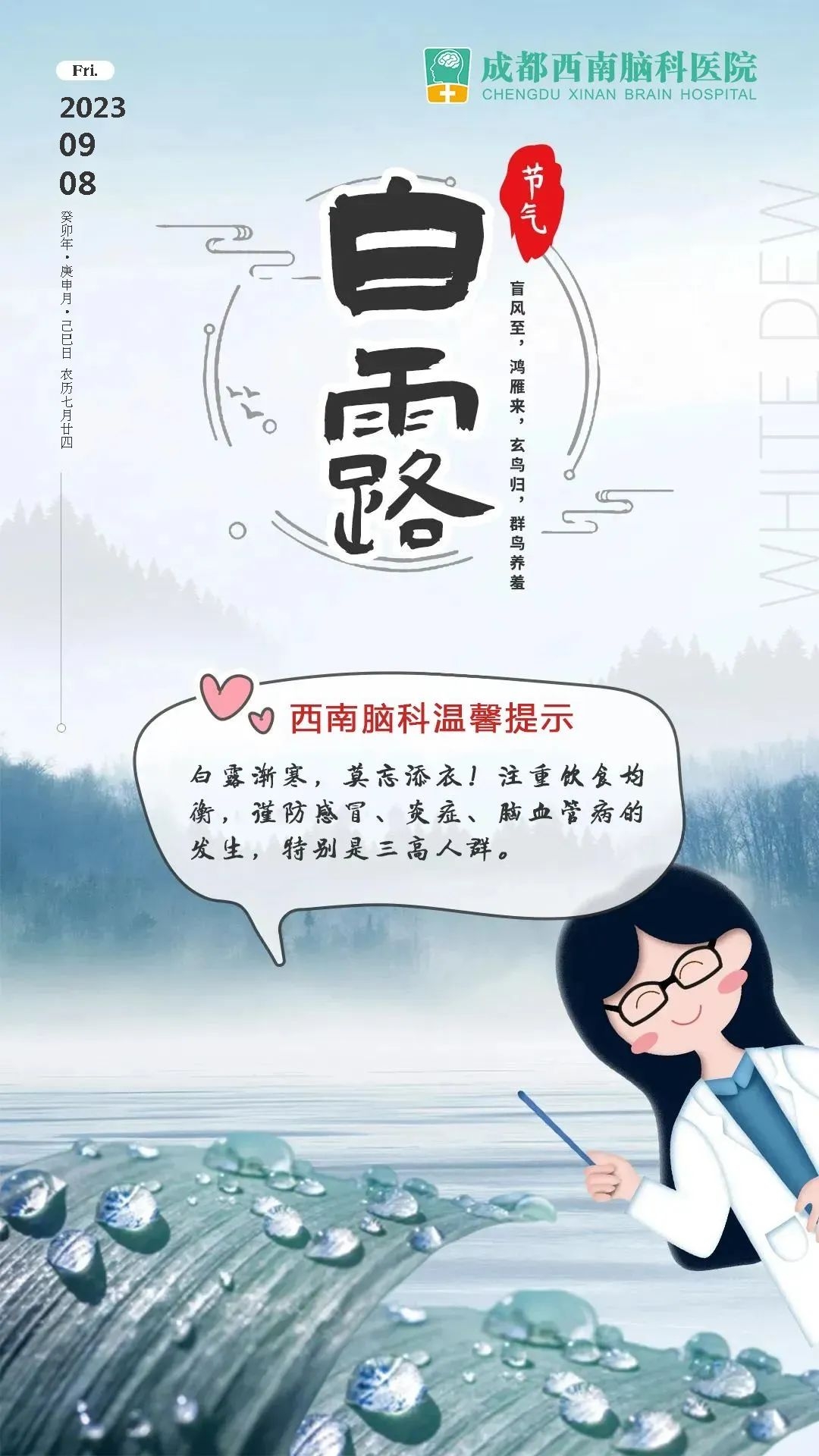 白露也是全年中昼夜温差较大的一个节气,此时,脑血管易受气温骤变影响引起收缩、痉挛,发生供血不足,从而诱发脑梗塞、脑血栓等。特别是中老年人,机体自身调整机能下降,对气候变化的耐受性差,极易发生脑血管疾病。对于脑血管疾病患者而言,这个时期可以称得上是“多事之秋”。