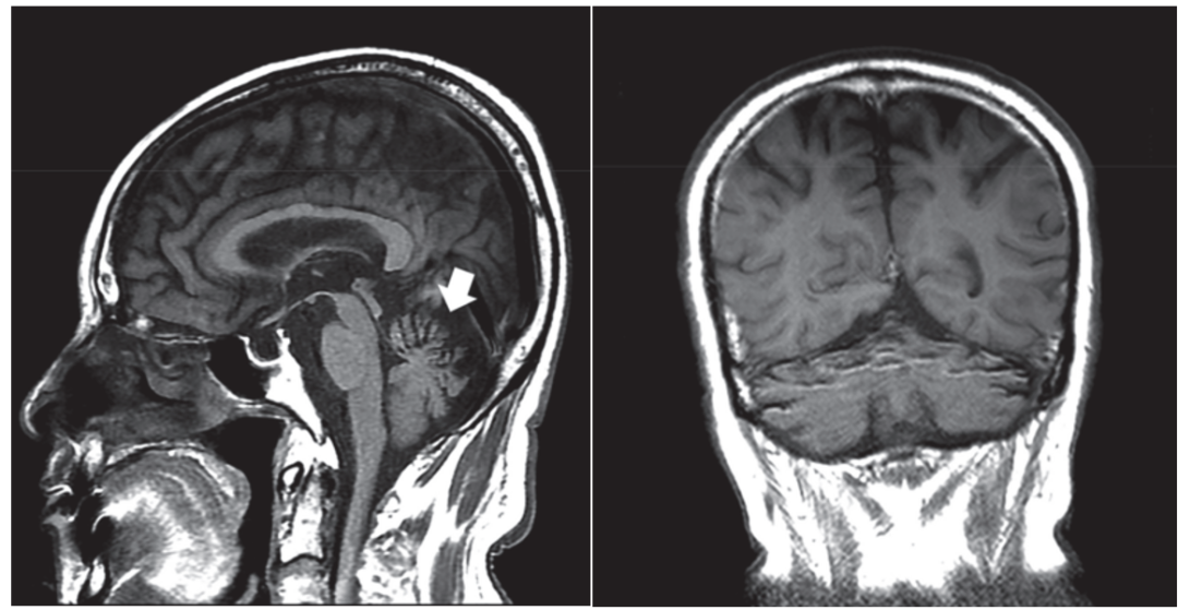 以小脑蚓部萎缩为主,环池、小脑上池、枕大池扩大,可合并大脑萎缩,主要的病理改变为小脑蚓部皮质变性。临床表现为共济失调、眼球震颤、言语缓慢、行走不稳。