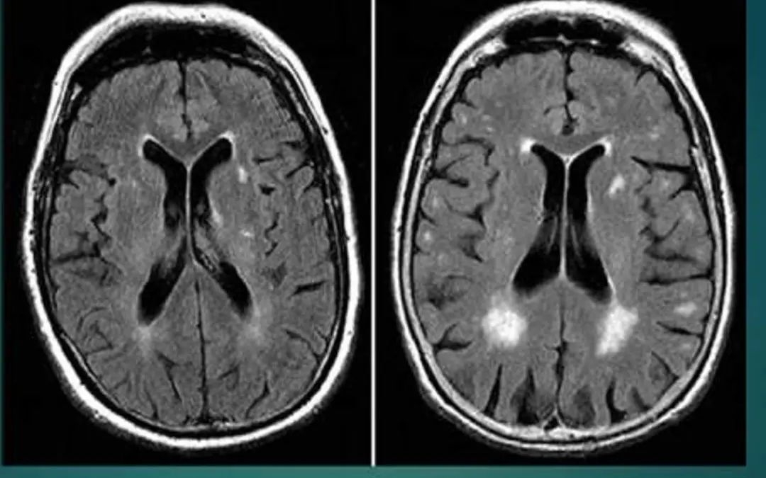 表现为皮层下白质及侧脑室周围多发点状或斑片状长Tl、长T2信号,可以与其他类型影像学损害并存。临床表现为精神障碍、行走困难、肌张力高、病理征阳性等。