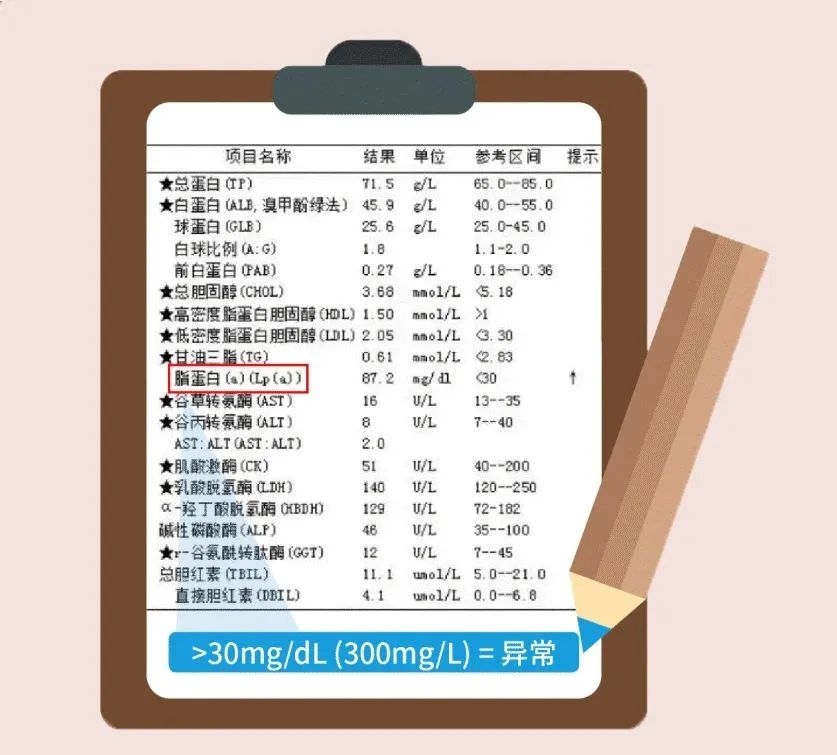 结合我国人群的特点,目前将300mg/L作为脂蛋白(a)的风险增高值。也就是说,脂蛋白(a)的正常值为<300mg/L。