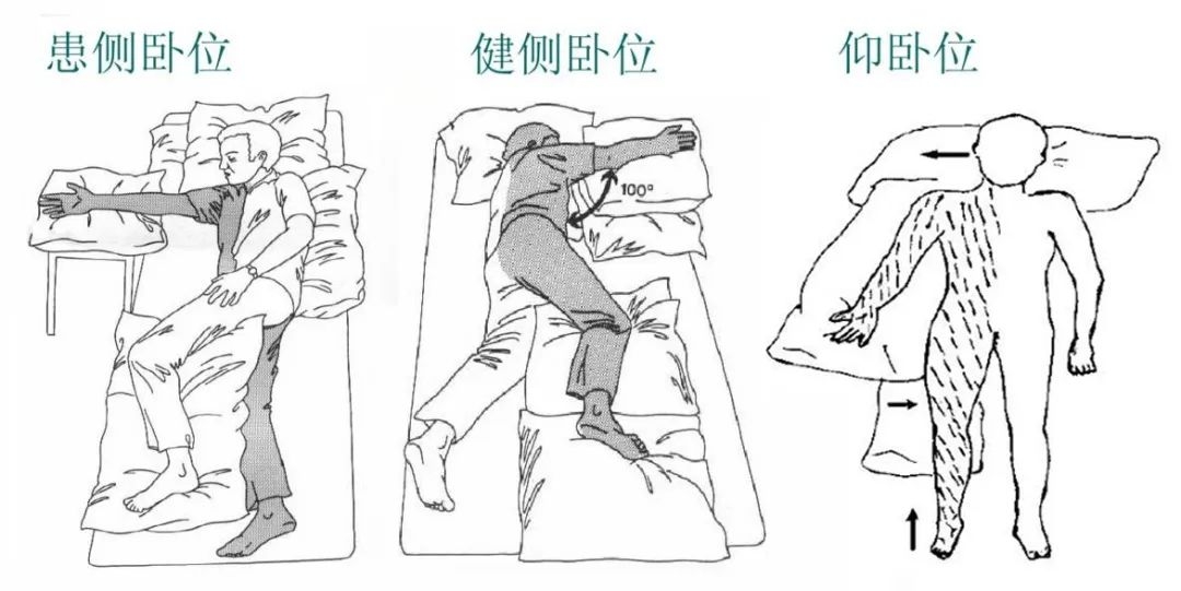 不管病人采取何种姿势,不管是平躺位还是侧卧位,都要保证病人患病侧胳膊可以伸直,腿要有适当的弯曲弧度。必要时可以将患者的肘关节和膝关节人为垫高。