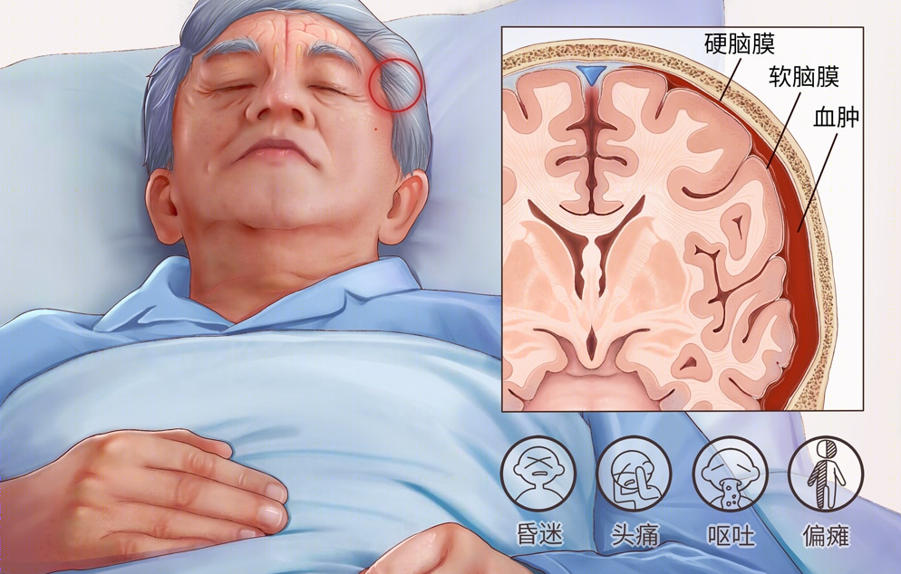 外力创伤导致:这个病常见于头部受到外力创伤后(如交通事故、跌倒、撞击头部等),导致颅内硬膜下的血管破裂,从而使出血累积在硬膜下腔。