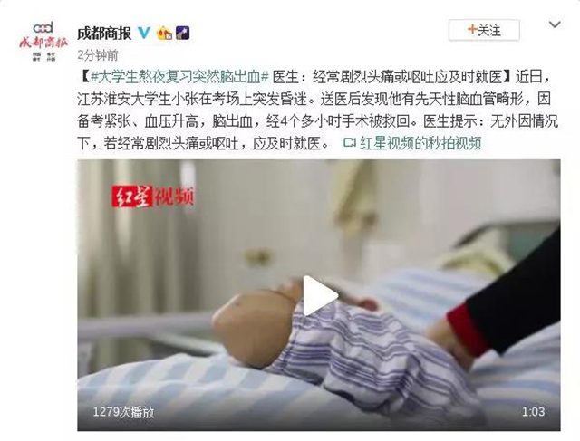 【健康小贴士】大学生熬夜复习突然脑出血!这些不起眼的行为可能