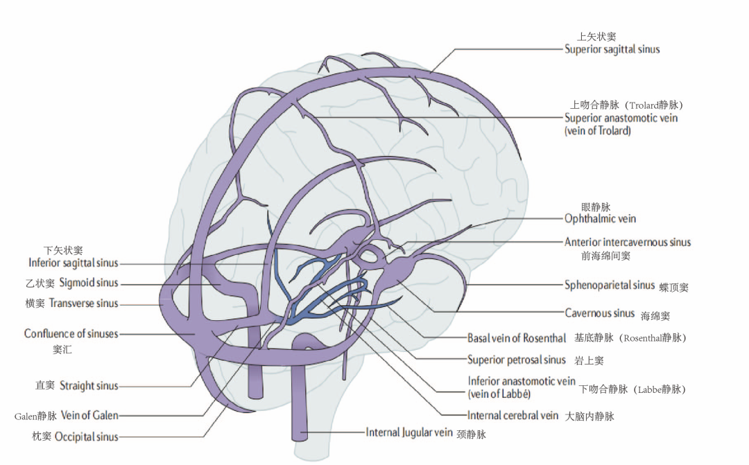 图3. 脑静脉系统解剖示意图。蓝色血管代表深静脉系统。