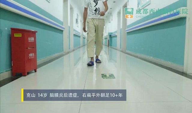 脑膜炎后遗症导致克山的右下肢足外翻畸形很明显,走路的时候甚至有点跛。只能慢慢走路。在学校的时候,克山的腿脚不太方便,但他还是坚持住校,基本生活方面,没有什么问题。但只能看着别的同学高高兴兴的上体育课,而他却因为身体原因,不能上体育课,他心里非常羡慕其他同学。但又没办法,因为家庭经济条件的缘故,一直没有进行正规治疗。