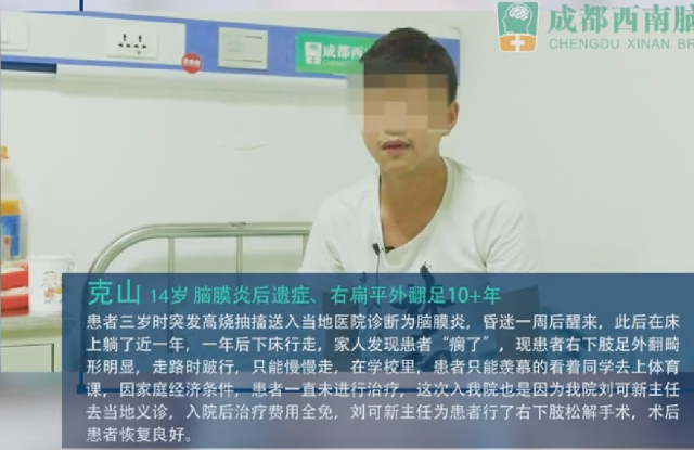 14岁的克山因三岁时突发高烧抽搐,父母以为是小感冒,后被送进当地医院检查,在当地医院治疗了两天,在高烧抽搐的第三天,克山被送到了县医院,被诊断为脑膜炎。在医院昏迷了一周后醒来,此后在床上躺了近一年,一年之后可以下床行走了,但家人发现克山“瘸了”。这一“瘸”就是10年。