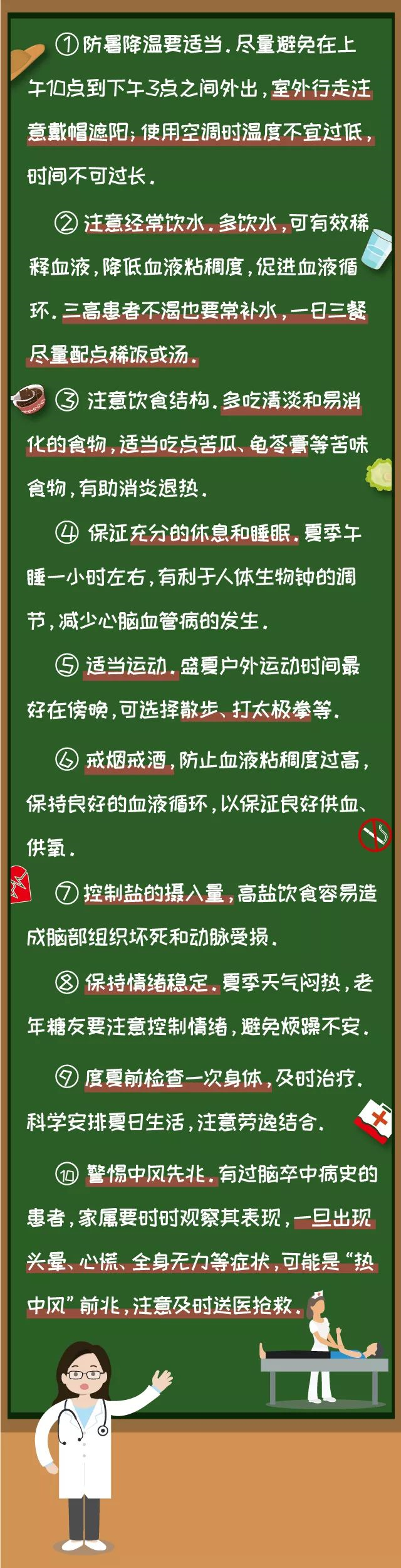 曾经有过小中风发作,但并未充分注重,也没有及时诊治的中老年人也是脑中风发作的高危人群。本来天气不太热,却突然感到闷热也是夏季中风的前兆之一。