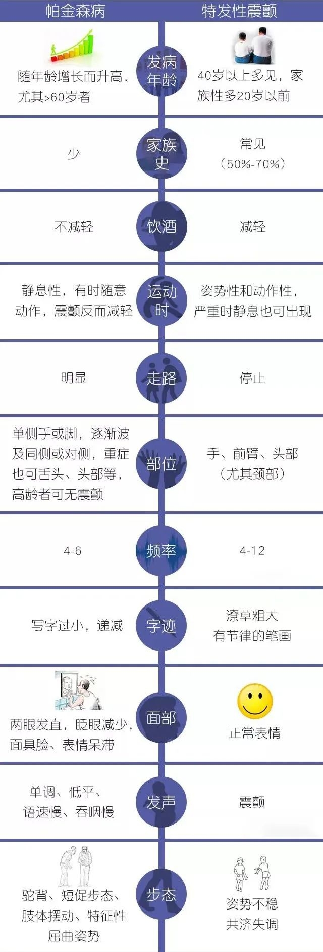 看文字太累?下面一图帮你区分帕金森病与特发性震颤,以后再也不会傻傻分不清: