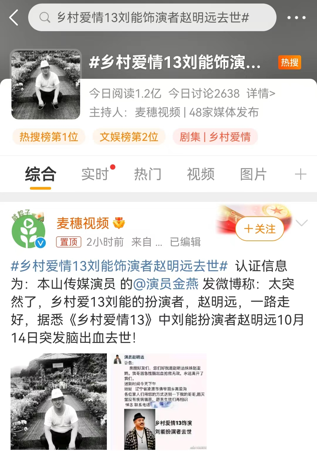 10月15日,据赵明远家人和多位演艺界人士透露,曾在东北农村喜剧片《乡村爱情13》中出演刘能的演员赵明远,突发脑出血于10月14日去世,享年42岁。