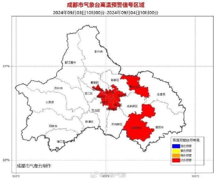 成都市气象台2024年9月3日10时00分继续发布高温红色预警信号:预计我市武侯区、锦江区、青羊区、成华区、金牛区、高新南区、高新西区和青白江区的所有镇(街道)未来24小时内最高气温将升至37℃以上,成都东部新区的大部分镇(街道)未来24小时内最高气温将升至40℃以上。高温时段主要出现在今日11时至19时。请注意防范。