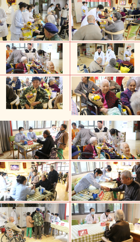 最后,医护人员们给每位老人送上了节日的鲜花和礼物,然后开始给老年人测血压、血糖、查体,询问和回答老人关于身体的问题,同行由康复医师给有需要的老年人进行按摩和锻炼指导。