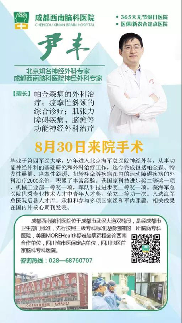 尹丰北京成都之间往返,只为服务更多脑科病患我院神经外科专家尹丰,是中国人民解放军海军总医院神经外科教授,也是中国微循环学会神经变性病专业委员会青年委员会常务委员、中国医师协会神经调控专业委员会青年委员,承担过多项国家级科研课题研究。从医20余年,尹丰已主刀完成各类疑难神经外科手术5000余例。