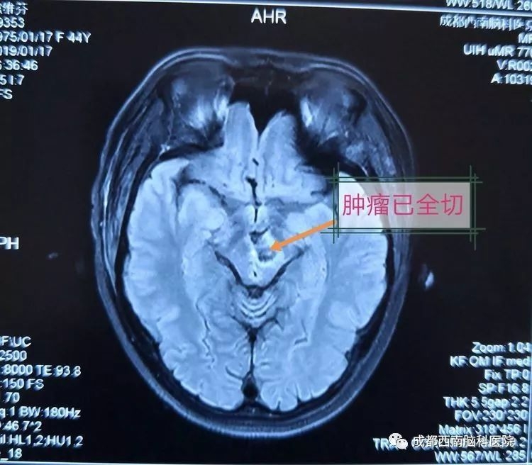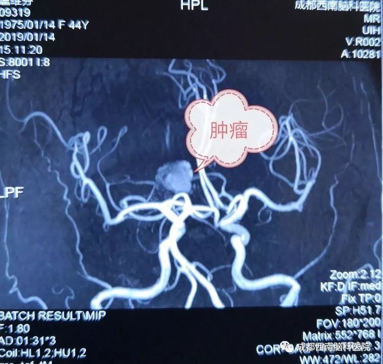 这样的情况下,她以“视物模糊伴重影18天,加重伴左眼睑下垂3天”入成都西南脑科医院。入院查体见左侧动眼神经麻痹,余未见异常。MRI检查显示,扈女士颅内的肿瘤位于中脑上端,经大脑向同侧丘脑发展,血管成像肿瘤显影良好,初步诊断为脑干肿瘤,海绵状血管瘤可能性大。
