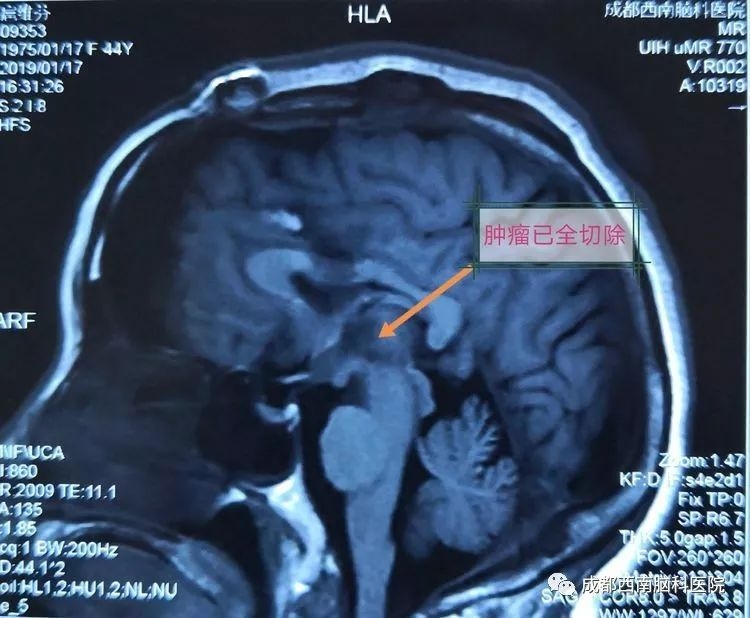术后当晚,医生检查发现,患者回答问题准确、切题,原有的颅神经麻痹、动眼神经麻痹没有加重,术前担心的肢体瘫痪症状也没有出现,理解力、反应力、记忆力、语言功能正常。术后第二天,患者视物清晰,四肢运动功能、感觉功能完好。