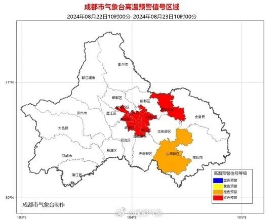 成都市气象台2024年08月22日10时00分更新高温橙色预警信号为高温红色预警信号:预计我市武侯区、锦江区、青羊区、成华区、金牛区、高新南区、高新西区和青白江区的所有镇(街道)未来24小时内最高气温将升至37℃以上,东部新区的大部分镇(街道)未来24小时内最高气温将升至38℃以上。高温时段主要出现在今日12时至19时。请注意防范。