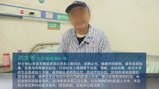2018年来到我院后,经医生会诊,由尹丰主任为刘大叔做了脑立体定向仪手术,解决右侧肢体的抖动,术后右侧抖动基本消失,刘大叔感觉非常不错。之后便开心的出院了。