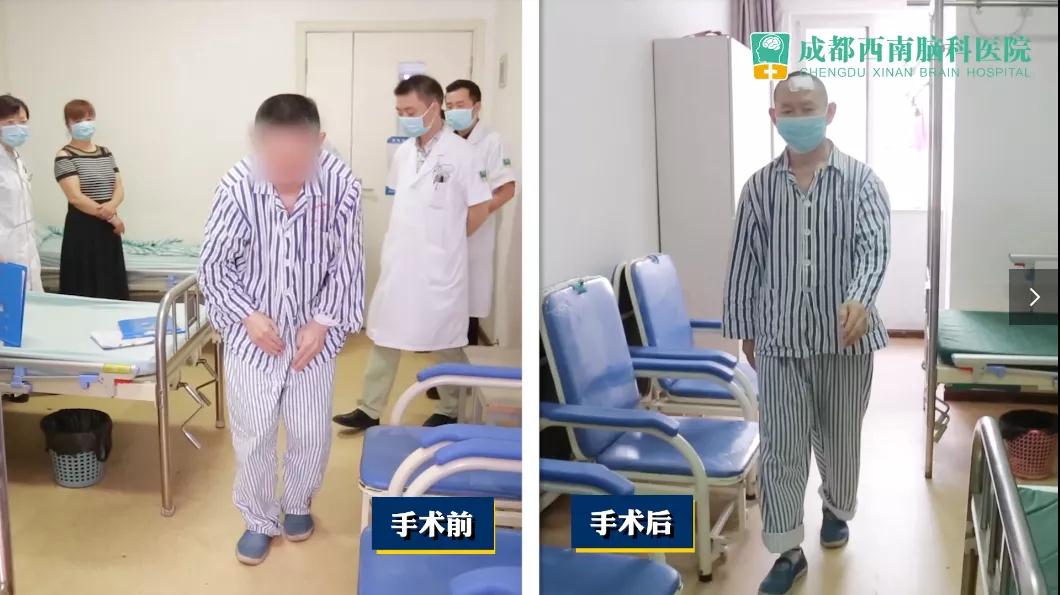 术后潘先生右侧肢体不再抖动,走路姿势好了很多,不再摇曳,身体也伸直了,精神状态好了很多。